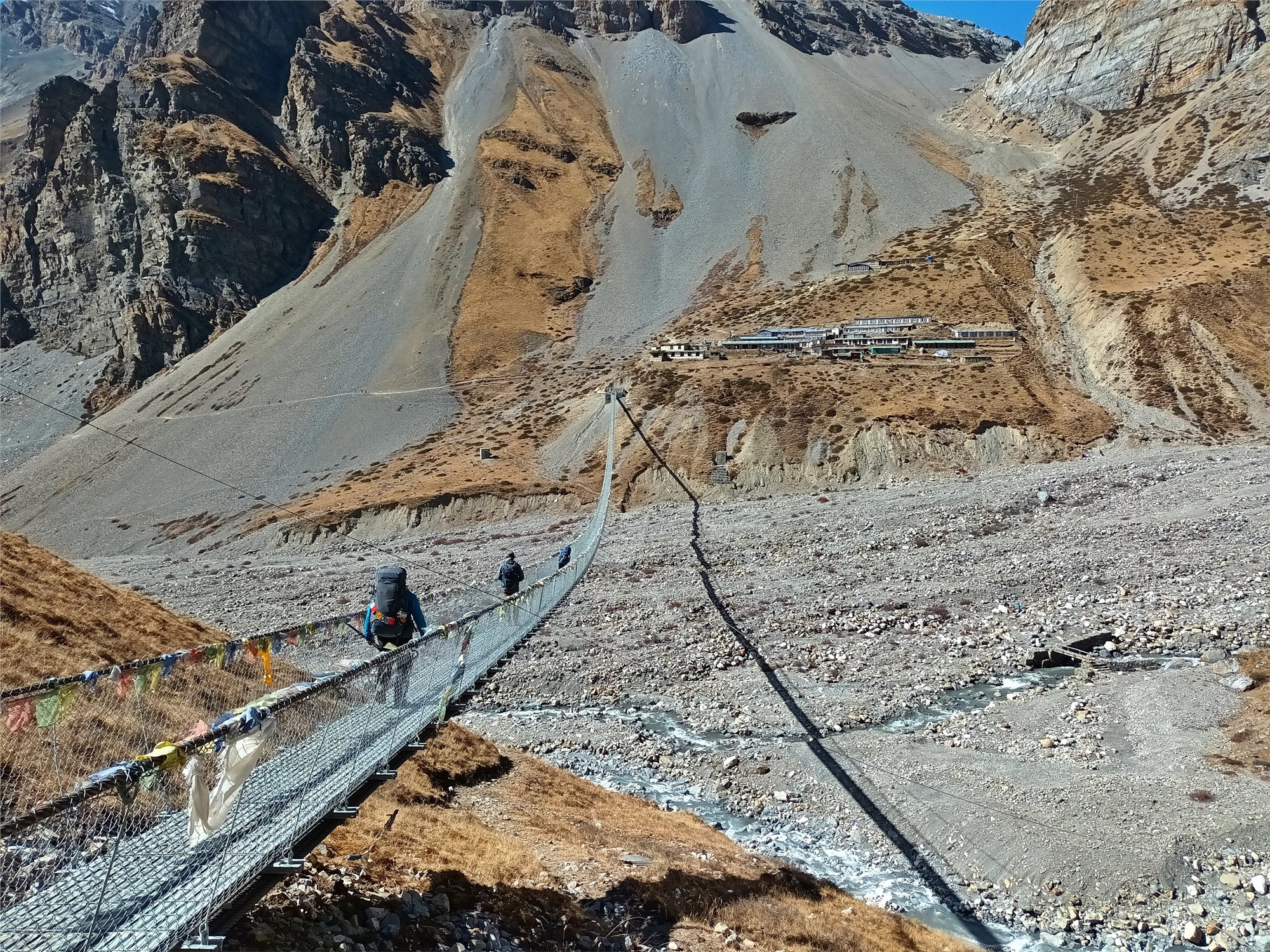 8. deň: Pokračujeme směrem k jednomu z nejvyšších průsmyků světa, ke kterému nám zbývají dva dny chůze. Dnes (6-7h, ↑1 000 m, ↓100 m) stoupáme podél řeky JARSANG KHOLA až do výšky 4 450 m, kde se ve vesnici THORUNGLA PHEDI ubytujeme. Cestou nás mimo jiné čeká přechod téměř 400 m dlouhého visutého mostu (zájemci mohou most obejít).