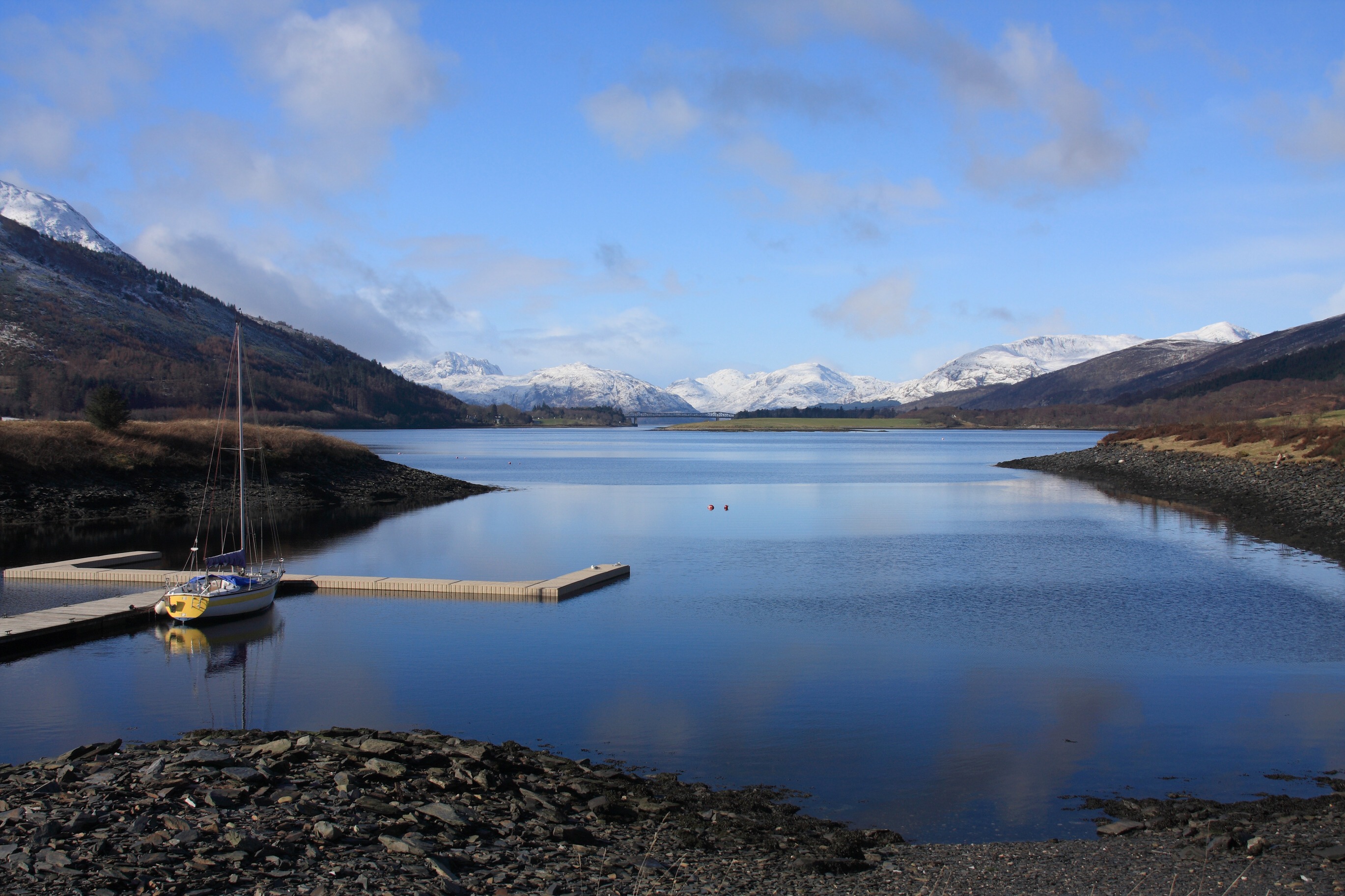 Údolí Glencoe na skotské vysočině Skotsko - pohled z vesnice Glencoe přes Loch Kinlochleven